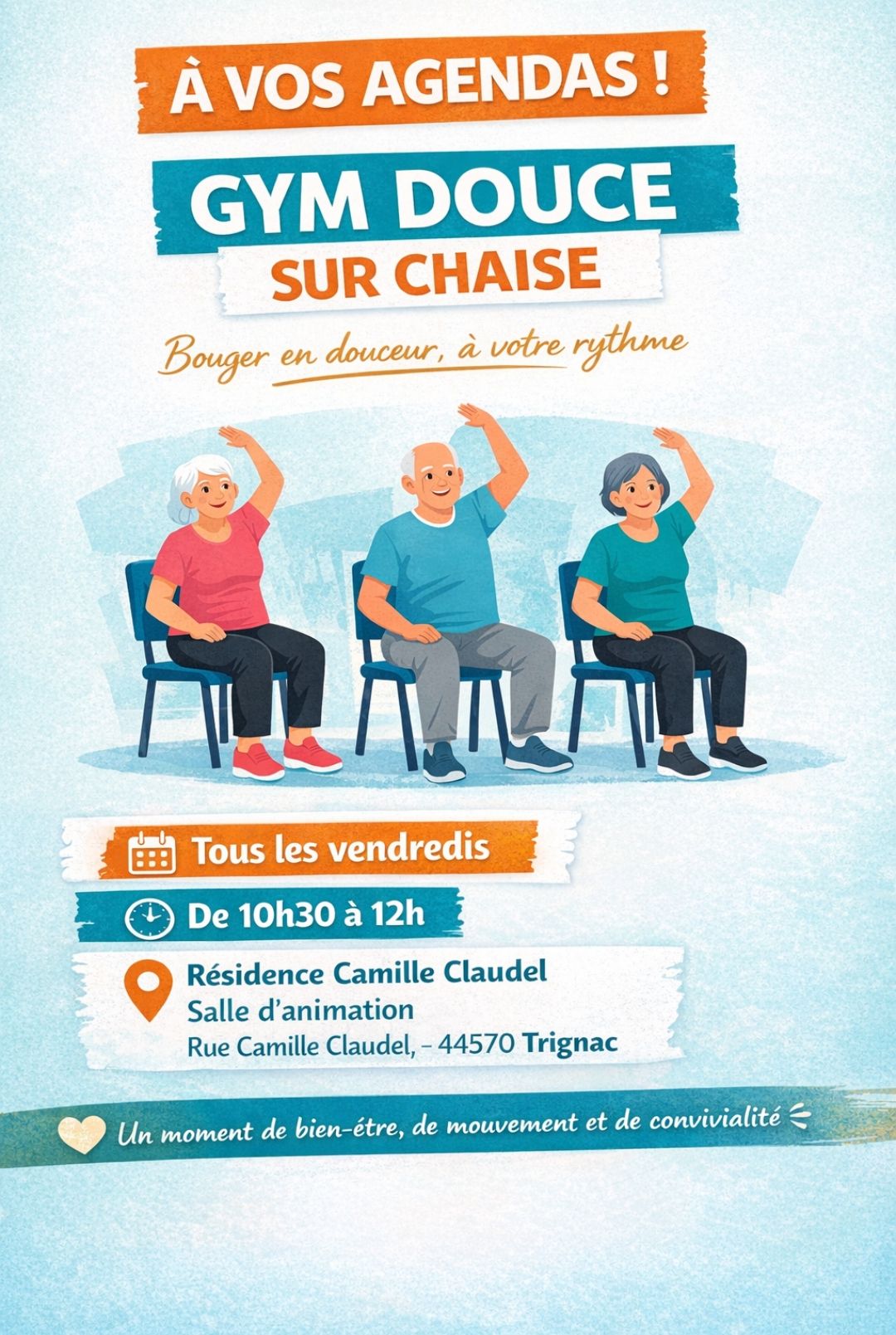 🤸‍♀️ Bougez ensemble, en douceur et à votre rythme, dans une ambiance conviviale et adaptée à tous.