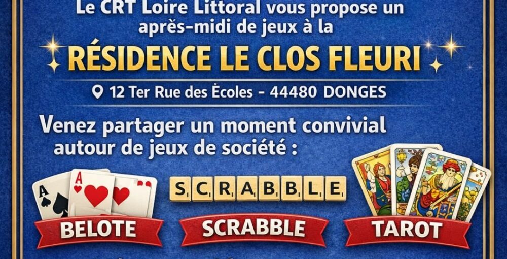 À partir du lundi 9 mars 2026, de 14h30 à 16h30, le CRT Loire Littoral vous propose un après-midi jeux à la Résidence Le Clos Fleuri à Donges.