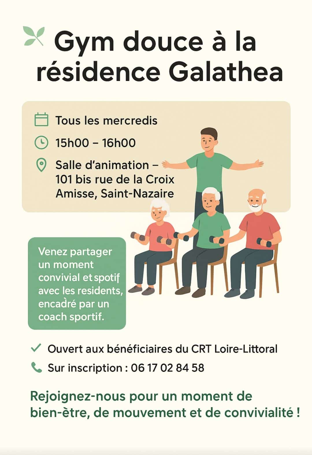 Tous les mercredis, rejoignez-nous pour une gymnastique sur chaise à la Résidence Galathéa de 15h à 16h, encadrée par le coach sportif Xavier. 💪 Une belle occasion de bouger en douceur et de garder la forme ! 📞 Inscription au : 06.18.02.84.58 📍 Résidence Galathea 101 bis rue de la Croix Amisse, 44600 Saint-Nazaire